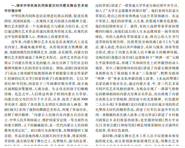 随着经济的快速发展和时代的进步,我国舞台艺术创作质量得到了极大提高。作为民族文化传承的重要 手段,舞台艺术创作对推动文化事业发展具有重要意义。本文探讨内蒙古舞台艺术创作的价值,分析内蒙古舞台艺术 创作面临的挑战,并给出相应对策,旨在为创作人员提供参考。