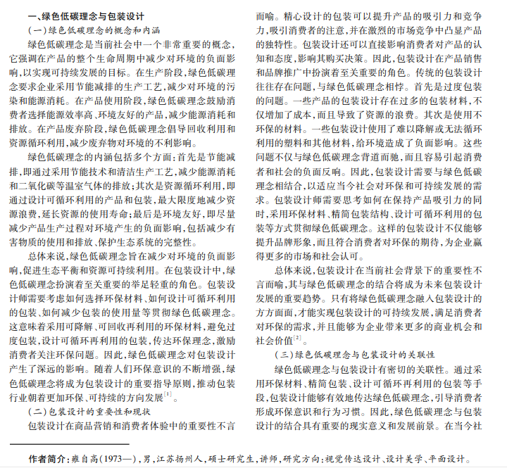 在当今信息迅速发展的时代,各个领域都在发生变化,各种高新技术不断涌现,绿色低碳理念逐渐深入人 心。“绿色低碳”对于人们来说,不仅是一个简单的概念,而且是一份责任,成为今后产品设计的主流方向。本文探讨 绿色低碳理念在包装视觉传达设计中的应用。