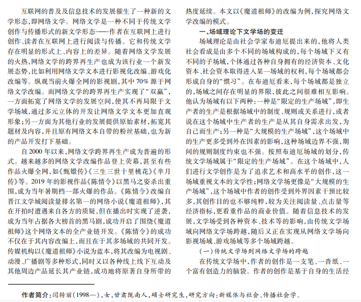 网络信息技术的发展催生了网络文学。网络文学是与传统文学既有区别又存在联系的新的文学形式。文 学场经历了从传统文学场向网络文学场的跨越,目前正在实现向电影、动漫、游戏等多元场域的跨越。从模式上看,网 络文学的跨界再生产主要有两种形式:一是纵向延展型的网络文学跨界再生产,也就是多维度地改编和再创作某一网 络文学作品,并整合由此产生的多种产品的传播和营销;二是横向整合型的网络文学跨界再生产,也就是多个原生网络 文学文本的整合开发。本文从场域理论出发探讨了网络文学场的变迁。