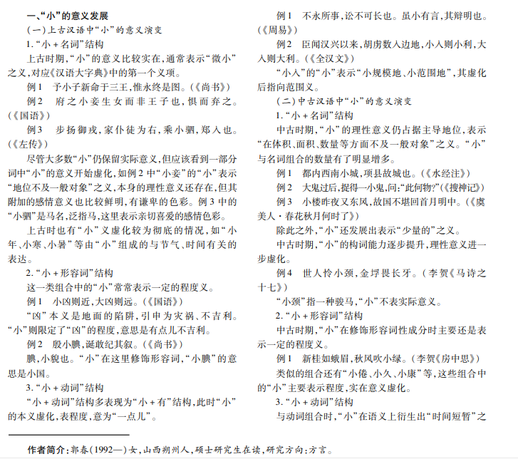 本文简要介绍了上古、中古、近代、现代汉语中“小”的功能由区别、说明向主观性较强的评价、形容发展, 以及“小”的含义逐步虚化,通过分析汉语方言中小称前缀的主要类型及意义,比较小称前缀的特征、汉语前缀的分类 以及“小”的意义演变过程,发现一些小称中的“小”仍然保留实在意义,与其他小称前缀丢失本义的情况并不相符。本 文认为,“小”的意义确实泛化但并没有完全虚化,故只能将“小”定义为“准词缀”,不能将其视为小称前缀