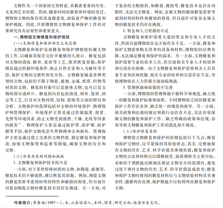 文物是人类宝贵的历史文化遗产,一旦遭到破坏将很难修复。因此,博物馆作为文物收藏、陈列和存放的 主要场所,做好文物保护工作非常有必要。本文分析博物馆文物修复和保护工作现状,指出存在问题和挑战,并提出相 应对策,通过案例分析,验证对策可行性和有效性,旨在为做好博物馆文物修复和保护工作提供有益参考。