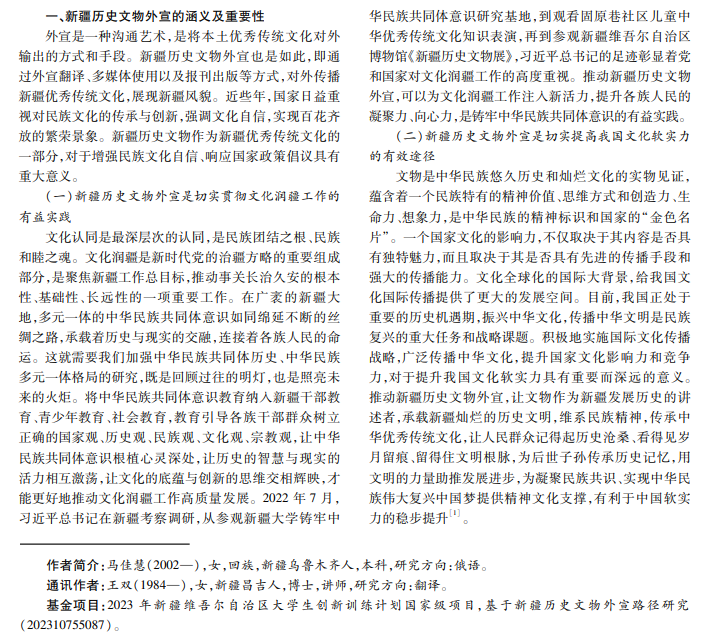 新疆历史文物“走出去”,对弘扬新疆历史文化、增强我国民族文化自信有着重要意义。外宣途径的选择 与运用将直接影响其传播效果。因此,本文着眼于新疆历史文物外宣途径的研究,通过分析新疆历史文物的外宣现状 以及外宣过程中存在的问题,提出可行性建议,以期构建多样化传播渠道,更好地展现新疆历史文物面貌,弘扬新疆历 史文化,加强“一带一路”倡议下丝绸之路经济带共建国家的文化交流和文化互鉴。