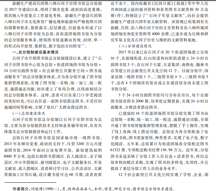 在县级公共图书馆总分馆制建设方面,各地因经济水平、政策支持力度不同发展得千差万别。西部经济基 础弱的边远地区,县级公共图书馆总分馆制发展同东部、中部地区相差极大。新疆生产建设兵团第八师石河子市作为 西部百强县市之一,经济基础较好,该市图书馆总分馆建设取得了一定的成果。本文以石河子市图书馆为例,通过分析 近五年该图书馆总分馆建设的历程,总结探索西部地区公共图书馆总分馆制建设的新路径。