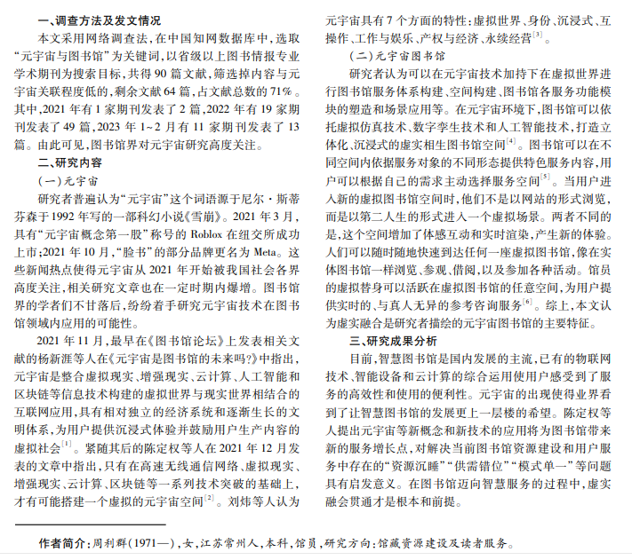 本文以国内图书馆界关于元宇宙图书馆方面的研究文献为例,采用网络调查法和文献研究法,梳理相 关论文,分析研究热点,归纳研究得出成果:元宇宙图书馆是整合元宇宙相关技术构建的虚实融合、和谐共生的, 立体化、沉浸式的图书馆空间。元宇宙图书馆的构建和发展需要成熟的元宇宙相关技术和支撑平台;需要完善的 法律法规以及相关规章制度的保障;需要高质量的业界人才;需要与社会力量合作,寻求跨专业的合作伙伴共同 推进。