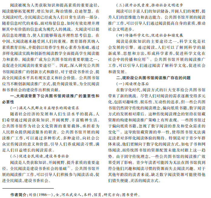 阅读是人类获取知识、开阔视野、提升素养的重要途径。在大阅读背景下,公共图书馆作为阅读推广的重 要阵地,肩负着引领全民阅读、提升国民素质的重要使命。本文基于大阅读背景,分析公共图书馆阅读推广的重要性和 必要性以及现阶段面临的挑战,并提出阅读推广创新思路,以期为有关人士提供参考。