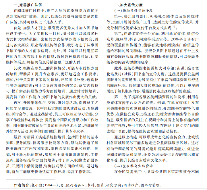 随着社会的快速发展,人们对知识的渴求越来越强烈。图书馆作为提供知识与文化书籍的关键场所,应在 推广阅读方面发挥效用,通过举办各类文化活动、与其他机构合作、利用现代科技手段、开展个性化的阅读推广,调动人 们的阅读兴趣。本文介绍县级公共图书馆开展阅读推广的创新方式。