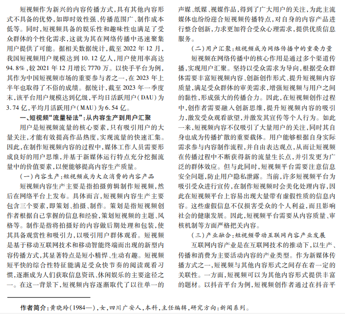 短视频作为当下极具影响力的互联网内容形态之一,凭借其短小精悍、生动有趣的特点,获得了广大网民 的青睐,在短时间内聚集了大量用户,给传统媒体带来巨大冲击。目前,短视频已成为我国互联网内容产业主要构成部 分。本文围绕短视频的“流量密码”展开讨论,并提出参考建议,希望能够优化短视频作品生产流程,使其社会效益与 经济效益获得提升。