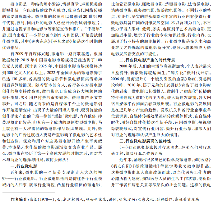微电影和短视频经过自媒体时代第一个十年的高速发展,其产量和产值都创造了新纪录,但在新形势下也 面临诸多问题,如审美混乱、过度商业化、形式雷同等,这些现象预示着微电影行业亟待变革。本文探讨近年来形成趋 势的行业微电影区别于主流微电影的优势和独特性,分析其未来发展方向,旨在为微电影行业新发展研究提供参考。