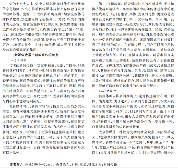 新闻媒体承担着重大的社会责任。随着新媒体技术的高速发展,务必要做好舆论引导工作,为产出的新闻 负责,确保其时效性与真实性。在网络信息技术不断更新迭代的大背景下,传统新闻媒体遭遇巨大挑战。本文结合实 际案例探讨新媒体背景下新闻写作的特点以及变化,希望为新闻同行提供具有参考价值的建议。