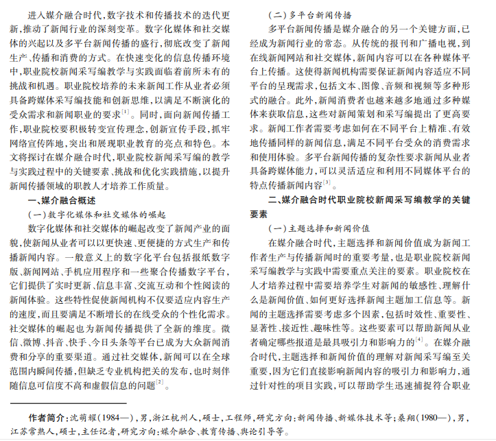 在媒介融合时代,内容全媒化、过程体验化、生产智能化、受众标签化、反馈动态化、资源矩阵化的媒介融合 特征日趋明显,对新闻标题、架构、内容、语言等都提出了新的要求。同时,数字化媒体和社交媒体的崛起、多平台新闻 传播的普及,对新闻采写编的教学与实践提出了更高要求。职业院校需采取针对性措施,帮助学生提高新闻素养,为新 闻行业提供富有潜力的储备人才,以适应快速发展的传媒环境。