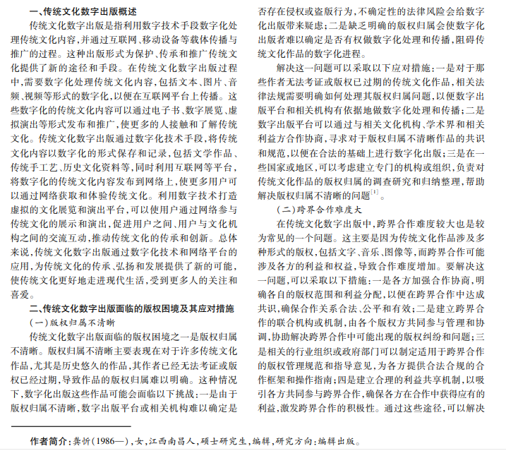 随着数字技术的快速发展,传统文化数字出版在推动文化传承和创新方面发挥着重要作用。然而,传统文 化数字出版在版权管理方面面临着诸多困境,这不仅影响了传统文化作品的合法权益,而且制约了传统文化的数字化 发展。本文旨在探讨传统文化数字出版面临的版权困境,并提出相应的措施,以期为传统文化数字出版版权管理提供 参考与启示。