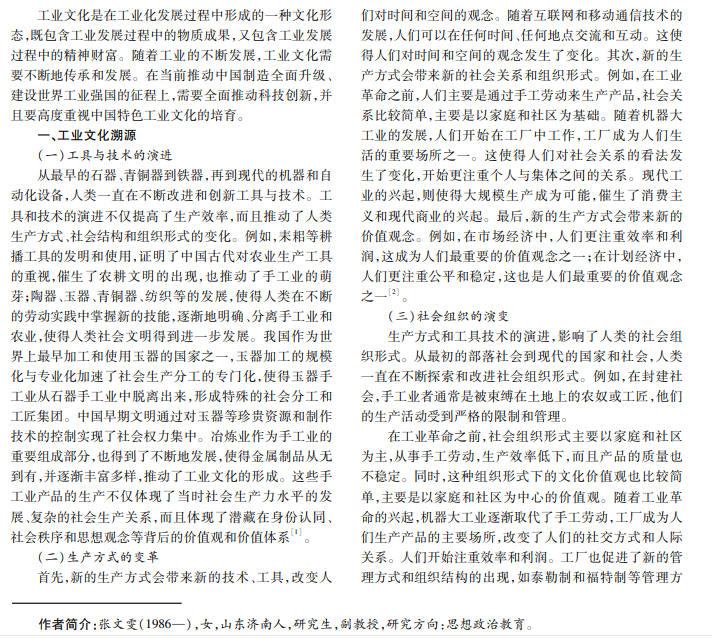 工业文化是人类社会发展进程中不断积累下来的重要财富,在实现工业化进程中扮演了关键角色。从历 史角度看,工业革命改变了传统生产方式,促进了工具与技术的演进,推动了社会组织的演变,形成了独特的工业文化; 从当代视角看,积极吸收借鉴国外工业文化的有益成分,提炼我国工业文化及工业精神领域的宝贵经验和价值内涵,对 于建构具有中国特色的工业文化价值体系有重要意义。