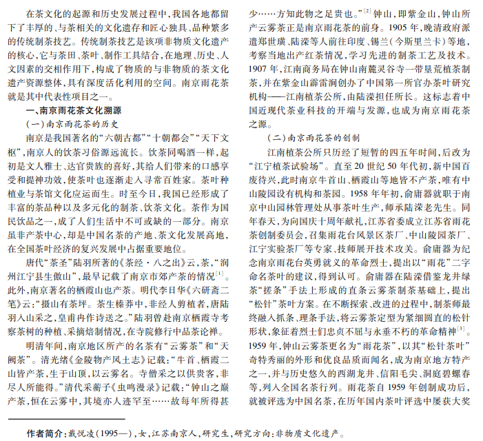 作为国家级非物质文化遗产传统绿茶(雨花茶)制作技艺的代表性传承单位,南京工匠、雨花茶传承人陈 盛峰及其盛峰茶业在南京雨花茶工艺与文化的传承保护方面做得尤为出色,在创新创意、产品开发、品牌营销、拓宽 推广渠道等方面有较大的发展空间,值得社会各界关注。本文通过阐述南京雨花茶的历史及相关文化遗产资源的 重要价值、开发意义,结合盛峰茶业发展现状,试论南京雨花茶文化遗产资源深入开发及创新利用的可行途径。