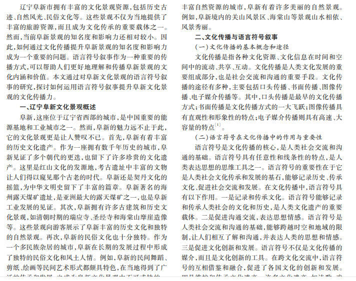 随着旅游业的发展,文化景观成为各地重要的旅游资源。通过语言符号叙事传播文化景观,成为学界关注 焦点。本文以辽宁阜新文化景观为例,探讨基于文化传播的语言符号叙事研究,分析语言符号叙事在阜新文化景观传 播中的作用及价值,并提出阜新文化景观的传播策略。