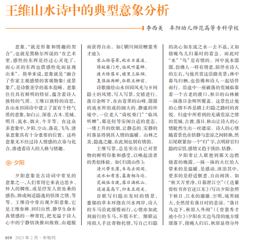 集诗歌、绘 画、音乐艺术于 一身的一代大诗 人王维,创作了 拥有“诗中有画, 画中有诗”的优 美意境的山水 诗。其山水诗 意境美的形成有 赖于夕阳、空山、 落花、飞鸟、清泉 等意象的创造性 运用。