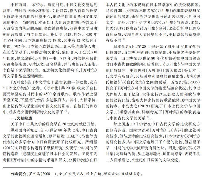 中日两国是一衣带水的近邻,有两千多年的交流历史。到了七、八世纪,中日友好往来与文化交流逐渐达 到了高潮,是中日交流史的一个重要时期。《万叶集》与唐诗是中日两国优秀的文学作品,中日两国的文化交流也体现 在文学作品中。本文以《万叶集》与唐诗为例,从主题与题材、词汇与意象、表现手法方面,考察七、八世纪中日两国的 文学交流。