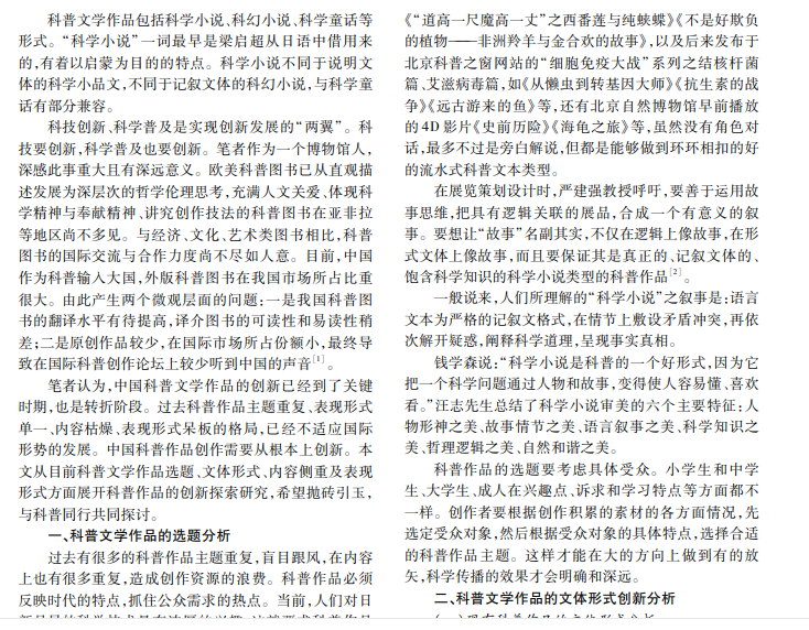 随着时代的发展,人们对科普作品的要求越来越高。本文研究近些年中国科普文学作品的特点和缺点,对 比国际科普创作的特色,从科普作品的主题选择、内容侧重点、文体形式和表现形式等方面展开系统分析,探讨中国科 普文学作品创新的方向。