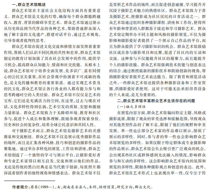 在当今时代,群众艺术馆作为丰富群众艺术生活的场所,面临着多重挑战,如缺乏多样性、互动性和教育项 目等。为解决难题,群众艺术馆应从拓展资源、加强互动体验和提供多元化教育项目等方面着手。通过引入新颖的展 示元素、设计互动性强的教育课程,并与社区、艺术家紧密合作,使群众艺术馆成为充满活力和创造性的艺术殿堂,促进 群众艺术生活的丰富。