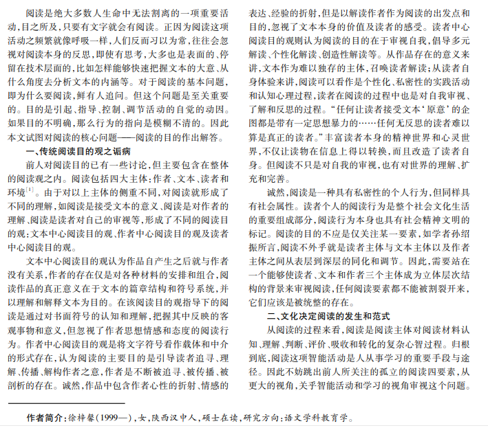 阅读自文字产生以来就是一项无比重要的活动,对当今人类来说更是如此。传统的阅读目的观割裂了阅 读过程中各个要素之间的关系,因此需要站在统一阅读各要素的角度———文化的角度审视阅读目的,重构阅读目的观。 文化作为作者、文本、读者存在的共同背景,决定了阅读的发生及其范式。但文化所包含的内容过于庞杂,文化基因作 为文化现象中的核心和基本的理念与精神,形成了贯穿阅读各要素及过程的轴线,因此阅读目的是指向文化基因的文 化传承。