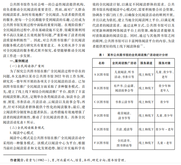 公共图书馆在推动全民阅读工作中发挥着重要作用,是提升全民文化素质的主要渠道之一。传统的公共 图书馆服务模式在推广全民阅读时存在服务方式单一、主题不突出、阅读意识差等问题。本文对公共图书馆如何推广 全民阅读展开全面研究,并以某省公共图书馆为例,浅析全民阅读推广过程中存在的不足,并提出相关对策,旨在为公 共图书馆推广全民阅读服务模式的相关研究提供参考。
