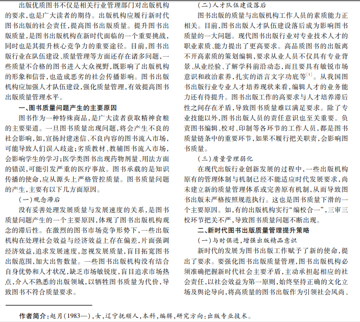 文化软实力是一个国家综合实力的体现,而图书是文化的重要载体。新时代,图书出版机构承担着文化传 承的使命,是推动社会经济发展、促进文化知识传播的主体,在现代文明进步发展中扮演着重要角色。高质量的图书除 了可以满足读者需求,为读者提供高价值的知识信息外,也有利于提升图书出版行业竞争力。新时代图书出版机构应 深刻分析图书质量问题产生的原因,并采取有效的质量管理策略,生产优质图书。