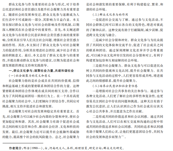 本文探讨群众文化参与对培养公民意识和社会责任感的积极作用以及对社会凝聚力的促进作用。群众文 化参与能让人们更关注社会问题,愿意为社会发展作贡献,同时可以提升社会凝聚力,推动社会和谐发展。本文总结群 众文化参与对社会的正面影响,强调鼓励和支持群众文化参与对社会建设和发展的重要意义,提出推动群众文化参与 的建议。