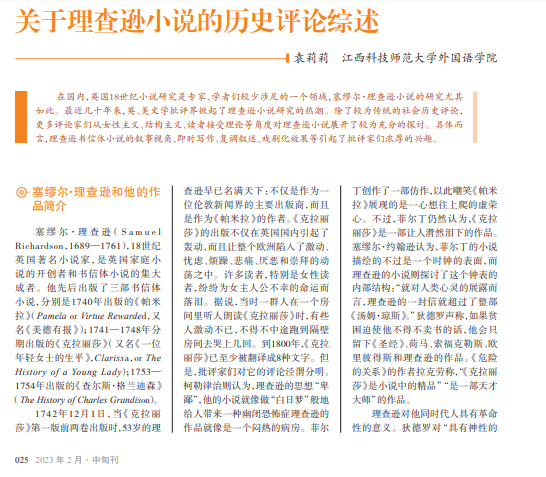 在国内,英国18世纪小说研究是专家、学者们较少涉足的一个领域,塞缪尔·理查逊小说的研究尤其 如此。最近几十年来,英、美文学批评界掀起了理查逊小说研究的热潮。除了较为传统的社会历史评论, 更多评论家们从女性主义、结构主义、读者接受理论等角度对理查逊小说展开了较为充分的探讨。具体而 言,理查逊书信体小说的叙事视角、即时写作、复调叙述、戏剧化效果等引起了批评家们浓厚的兴趣。
