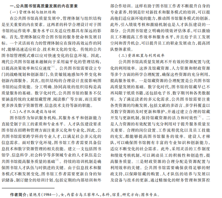 公共图书馆是承载知识、文化、历史的重要场所,为广大市民提供了开放的学术资源和多元化的文献服务。 公共图书馆作为信息中心,承载了社会的文化记忆,既是学术交流的平台,又是广大读者汲取知识的福地。因此,公共 图书馆不仅是储存书籍的场所,而且是城市文明的智慧集结地。本文研究公共图书馆高质量发展的关键要素,旨在为 公共图书馆的发展提供深刻思考与实质性建议。