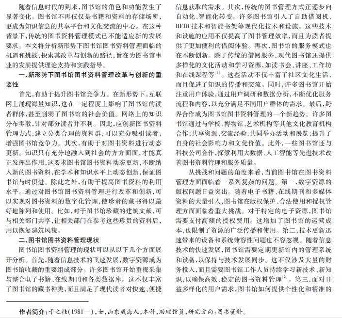 在新形势下,图书馆的图书资料管理面临着诸多机遇和挑战。随着科技的进步和用户需求的变化,传统的 图书资料管理方式已难以满足现代社会的需求。探索图书资料管理的改革与创新成为图书馆重要研究方向。本文阐 述图书馆图书资料管理的现状,并分析新形势下图书馆图书资料管理的改革与创新策略。
