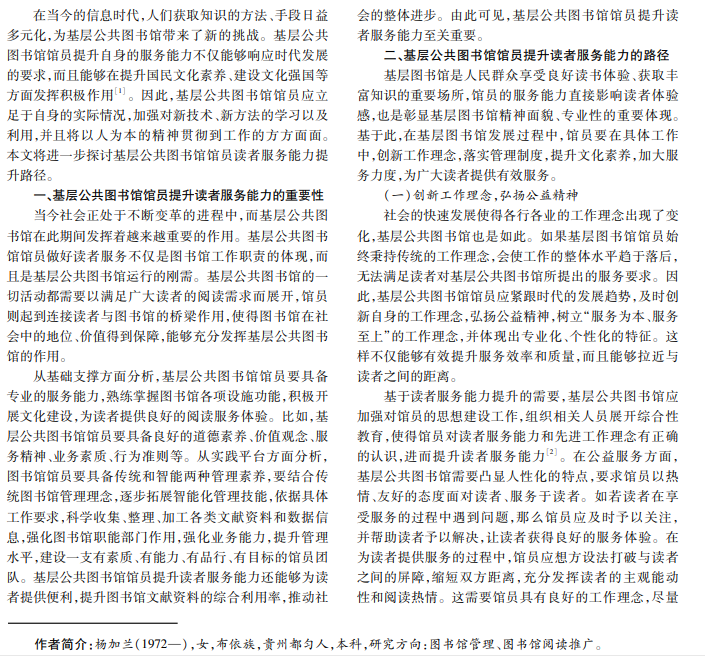 基层公共图书馆作为直接面向人民群众的公共场所,对馆员的读者服务能力有较高要求。馆员应秉持与 时俱进的思想,优化自身知识储备与实践技能,为当地文化事业的发展作出贡献,促进国家文化事业的进步。本文对如 何提升公共图书馆馆员读者服务能力展开探究。