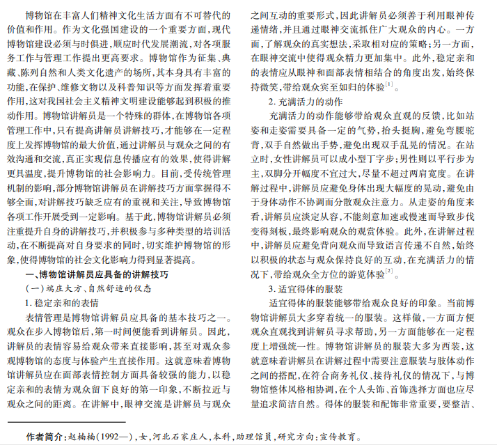 博物馆作为人们了解历史文化的重要平台,受到社会各界的广泛关注。讲解员作为博物馆的重要一员,一 定程度上代表着博物馆的整体形象与服务水平。高超的讲解技巧能够满足观众的需求,提高观众满意度。因此,博物 馆必须加强对讲解员讲解技巧的培养,提高讲解员综合素质。本文就博物馆讲解员应具备的讲解技巧展开分析,并提 出有效提高讲解员讲解技巧的措施。