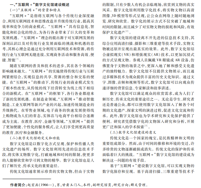 随着互联网的飞速发展,“互联网 +”已经成为各行各业的关键词之一。数字文化馆作为文化遗产传承与 创新的重要载体,逐渐融入了“互联网 +”模式。本文围绕“互联网 +”这一概念,研究数字文化馆建设,并探讨其在文 化传承与创新中的作用,以期为数字文化馆的建设与发展提供参考。