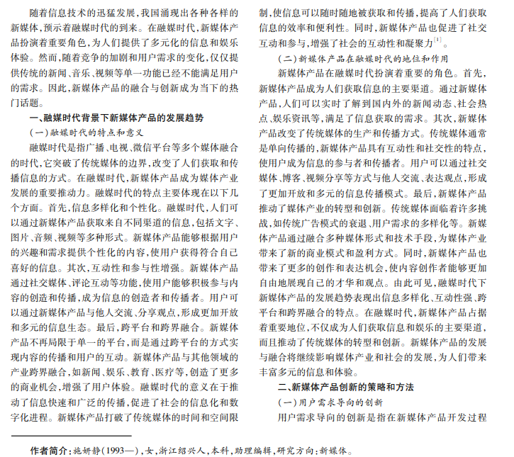 随着融媒时代的到来,新媒体产品的融合与创新成为一个重要课题。本文旨在分析新媒体产品在融媒时 代的发展趋势,探讨其融合与创新的特点和影响,并通过研究新媒体产品案例和相关理论,提出观点和建议,以促进新 媒体产品的融合与创新。