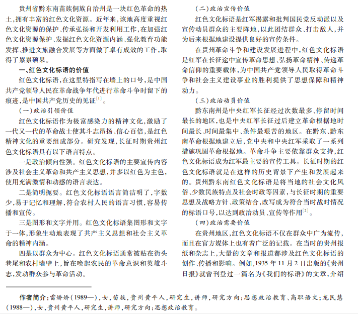 红军长征时期,标语作为一种宣传工具,起到了鼓舞士气、提高战斗力的作用。标语不仅传达了红军战斗 目标,而且表达了共产党人的信仰和为民族解放事业而奋斗的决心。红色标语见证了革命先烈的坚定信念和英勇斗志, 不仅是文化遗产,而且是新时代建设前进的动力源泉,对红色文化标语创新性发展和创造性转换是新时代的重要命题。