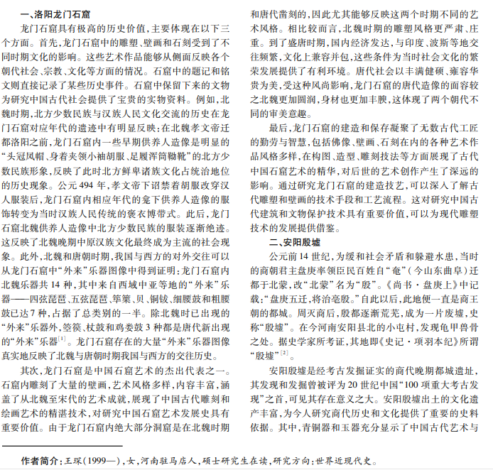 文化遗产是传承历史文化的载体,它们记录了人类历史上的重要事件、人物和社会现象,是人类文明的重 要组成部分。河南的五项世界文化遗产见证了中国社会的历史变迁和文化发展,不仅具有厚重的文化底蕴,而且为后 世研究历史提供了宝贵的实物资料。本文从历史学角度探讨河南世界文化遗产的价值。