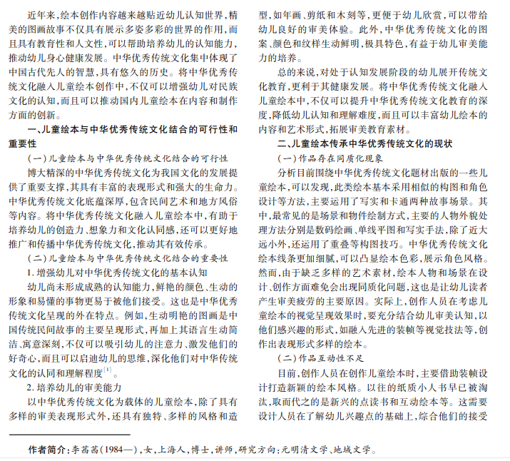 儿童绘本具有精美的图画和丰富的内容,可以培养幼儿想象力,推动其早期情感和思维的发展,被视为幼 儿世界观的主要培养载体之一。如何在儿童绘本中融入中国优秀传统文化元素,引导儿童了解中华优秀传统文化,增 强其民族认同感,及丰富传统文化教育载体的种类,是近几年社会各界的关注焦点。本文重点探讨儿童绘本中优秀传 统文化的有效传承路径。