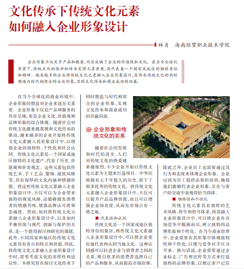 企业形象不仅关乎产品和服务,而且反映了企业的价值观和文化。在当今全球化 背景下,传统文化的保护和传承变得尤其重要,其代表着一个国家或地区的独特身份 和精神。越来越多的企业将传统文化元素融入企业形象设计,在传承传统文化的同时 塑造与时代相契合的企业形象,实现文化传承和商业成功的双赢。