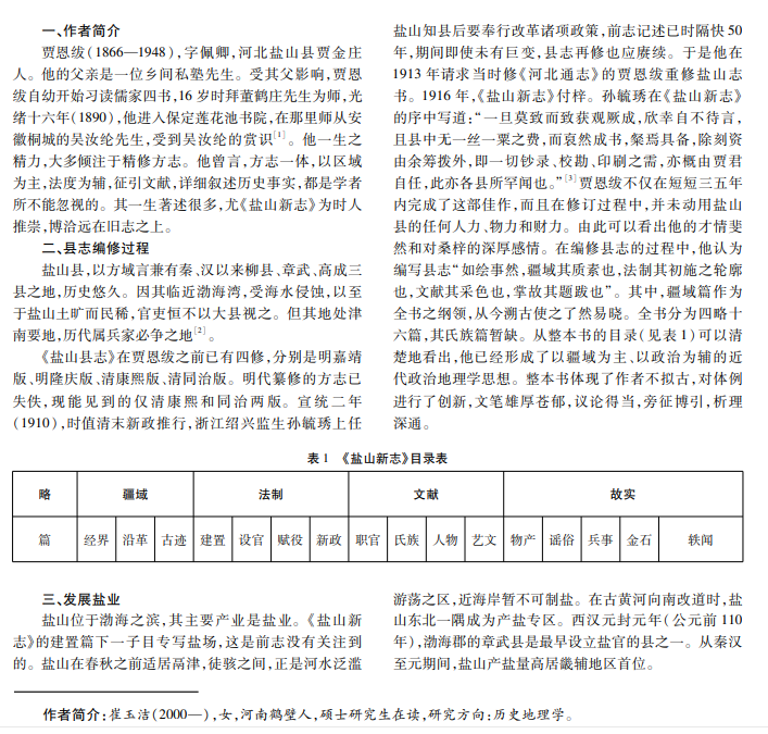 成书于 1916年的《盐山新志》是河北省盐山县一部叙述完备的地方志。该志由“燕南三杰”之一贾恩绂纂 写,其记事时间上起春秋时代,下至民国五年,是不可多得的研究盐山地方的佳作。本文从《盐山新志》的作者、编修过 程和主要内容等几方面挖掘其有价值的历史信息。