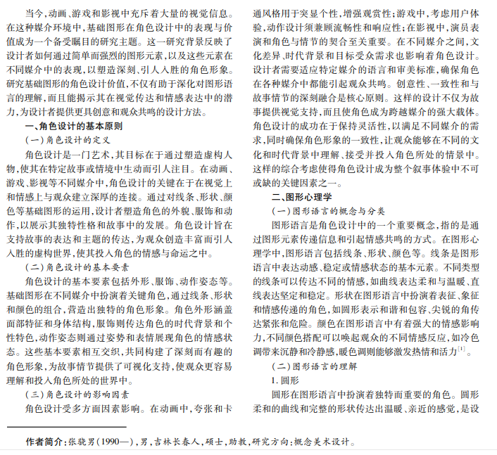 在角色形象设计中,基础图形扮演着不可或缺的角色,其通过简洁而强烈的形状、结构和颜色,为角色注入 生命力与个性。本文探讨基础图形在动画、游戏和影视等媒介中的表现与价值,从图形语言的概念、不同图形的特性, 到基础图形在角色情感表达、记忆与观众沟通中的影响,深入剖析基础图形对角色设计的重要性,并揭示基础图形在塑 造角色形象上的创新与实践。