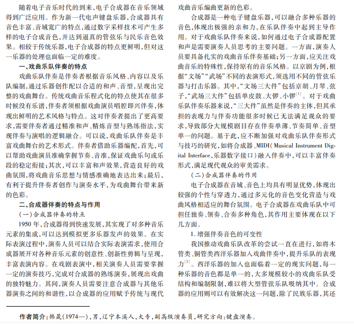 为满足现代观众多样化的文化生活需要和审美需求,戏曲乐队伴奏朝着技巧化、多元化发展。本文分析戏 曲乐队伴奏的特点,探讨合成器伴奏的特点与作用以及其与乐队其他乐器的配合,对合成器在京剧、淮剧、锡剧、花鼓戏 中的具体应用展开讨论,以促进戏曲伴奏形式与风格的创新。