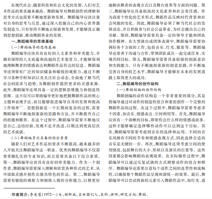 舞蹈作为一门跳动的艺术,将人体造型、动作、情感融为一体,产生特有的意象境界,达到肢体与心灵的统 一、情感与行为的和谐。创意性思维在舞蹈编导中非常重要。本文重点研究舞蹈编导思想创新,以期帮助舞蹈工作者 创作出可感可知、精美绝伦的舞蹈艺术作品。