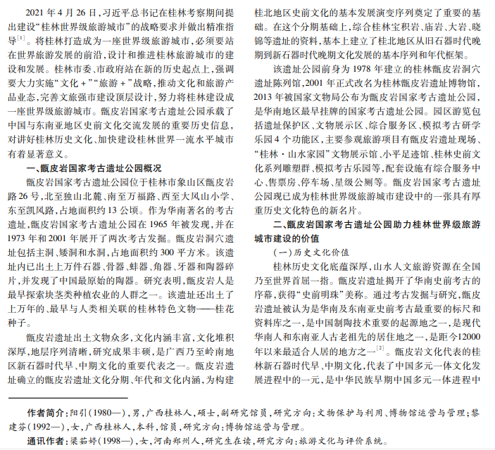 甑皮岩国家考古遗址公园作为史前中国多元一体进程的文化源流之一,承载了中国与东南亚地区史前文 化交流发展的重要历史信息,具有深厚的历史文化价值、科学研究价值和创新旅游发展价值。在持续推进桂林世界级 旅游城市建设过程中,甑皮岩国家考古遗址公园面临着品牌知名度低、旅游产品体系和体验形式缺乏创新、游客推荐和 重游意愿低等发展问题,急需解决对策,这对于将桂林建设成为世界级旅游城市具有重大意义。
