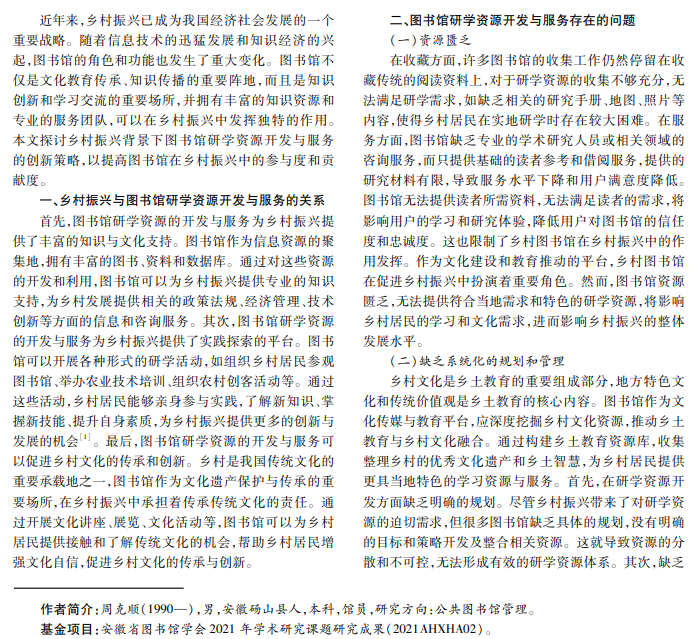随着社会的进步和经济的发展,乡村振兴战略成为我国当前的重要战略之一。图书馆作为文化传承和教 育的重要载体,承担着推动乡村振兴的重要使命,因此应积极开发研学资源,创新服务模式,助力乡村文化繁荣和经济 发展。然而,目前图书馆在研学资源开发与服务方面存在一些问题,如资源匮乏、缺乏系统化的规划和管理等。本文探 讨乡村振兴背景下图书馆研学资源开发与服务的创新策略,为图书馆的发展提供建议和参考。