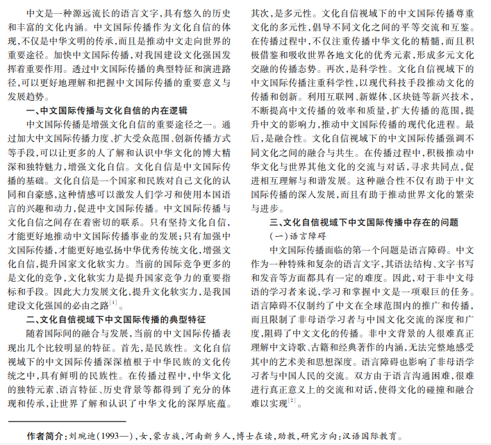 坚定文化自信是实现中华民族伟大复兴精神的重要支撑,也是中文国际传播的重要指引。在当前全球化 发展的背景下,中文国际传播已经进入新的阶段,呈现出一系列典型特征。了解中文国际传播的典型特征与演进路径, 对于提升中国文化影响力、国家形象具有重要意义。本文探讨文化自信视域下中文国际传播的典型特征与演进路径, 以供参考。