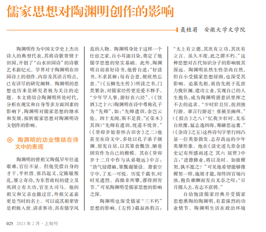陶渊明自幼受儒 家经典教育,有着强烈 的功业情结,其诗文创 作从思想内涵到语言 风格受《论语》影响至 深。探析儒家思想对 陶渊明创作的影响,能 更好地了解陶渊明及 其作品,了解儒家典籍 在古典诗文创作中的 深远影响。