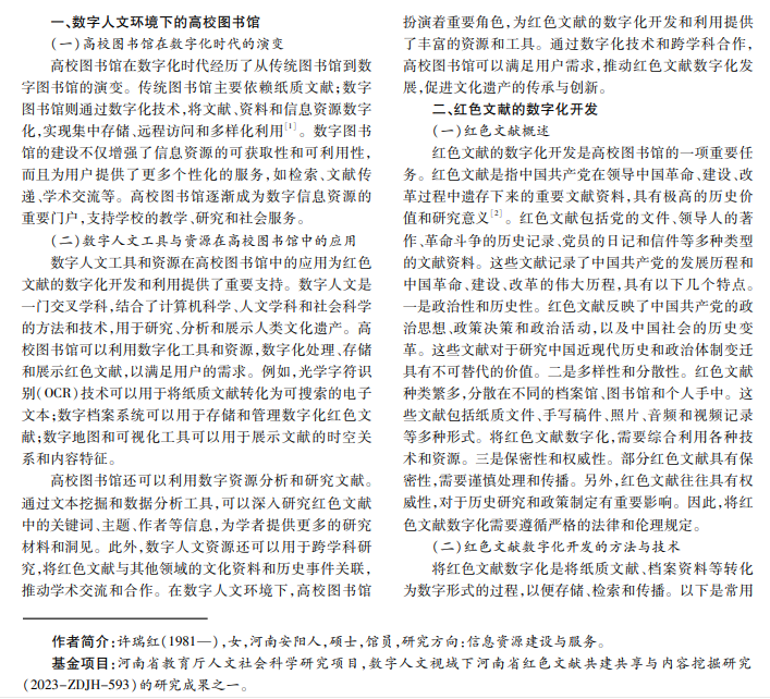 在数字人文环境下,高校图书馆在红色文献数字化开发与利用方面发挥着重要作用。红色文献记录了中 国共产党的历史和政策演变,对其展开数字化开发,有助于保护文化遗产和支持学术研究。红色文献的数字化开发与 利用对于学术和文化传承至关重要。本文探讨红色文献的特点、数字化方法、数据处理、资源管理以及红色文献的未来 趋势和面对的挑战。