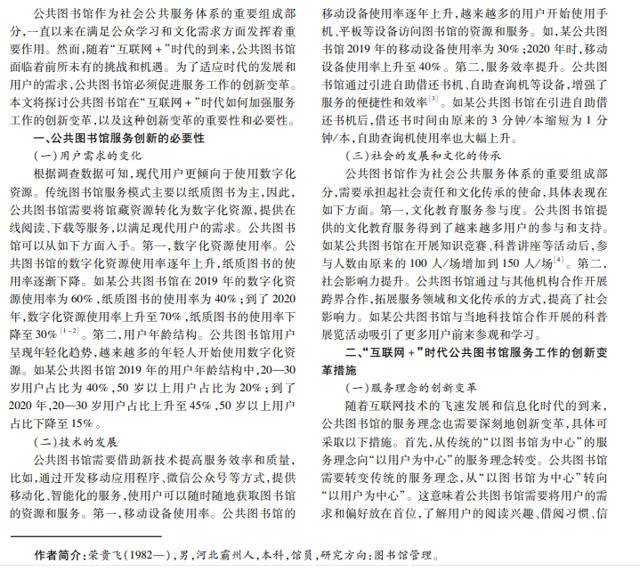 本文探讨“互联网 +”时代公共图书馆服务工作的创新变革,从服务理念、服务模式、服务内容、服务手段 四个方面,分析公共图书馆适应时代发展和用户需求创新变革的必要性和必然性。通过主动式服务模式的建立、多样 化阅读推广活动的开展、跨界合作的探索等多种方式,提升服务质量、拓展服务范围、提高社会影响力,更好地服务于社 会和公众。