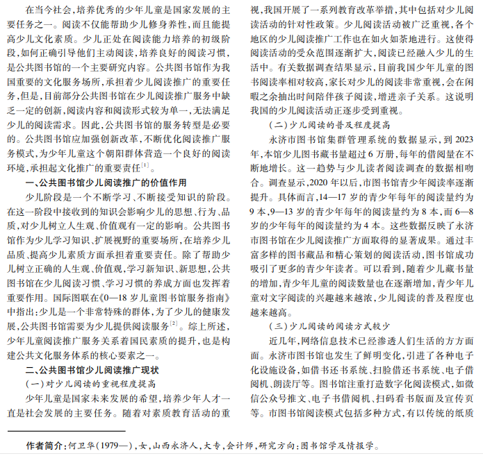 公共图书馆是我国公共文化服务的基础机构,也是推动全民阅读活动开展的重要场所。全民阅读活动开 展对我国国民素质的提升尤为重要,特别是少年儿童阅读活动的开展,关系着我国素质教育的提升。基于此,本文探讨 公共图书馆少儿阅读推广服务转型创新,以期为公共图书馆的服务转型提供帮助。