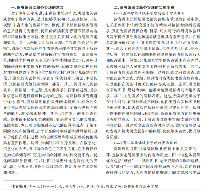 在信息时代,阅读形式正在经历深刻变革,从实体书籍延展到电子资源,从静态的阅读室跨越到活跃的线 上平台。图书馆的角色也由简单的资源提供者转换为知识服务者。在此大背景下,图书馆阅读服务管理的重要性愈发 凸显。其关键在于,如何运用科学的管理方法,为读者提供优质、高效的阅读服务,让读者在便捷获取信息的同时,享受 更高层次的阅读体验。