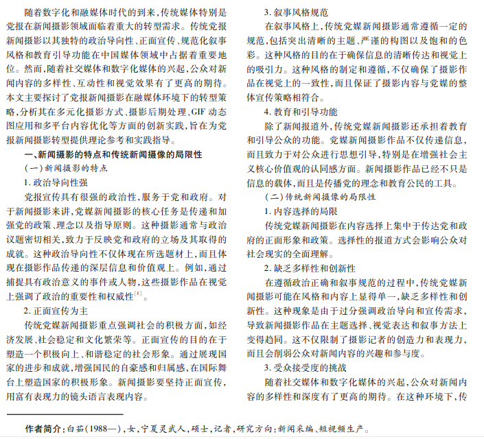 随着数字技术的迅速发展和媒体消费习惯的变化,传统党报面临着前所未有的挑战和机遇。作为党报摄 影记者,每天在纷繁的大千世界游弋,如何及时发现并捕捉到有新闻价值的动态事件,并用镜头记录下来,并不容易。 本文分析传统党报新闻摄影的特点和局限性,探讨党报新闻摄影在融媒体环境下的转型策略,并通过具体案例分析,展 示这些策略在实践中的应用和效果。